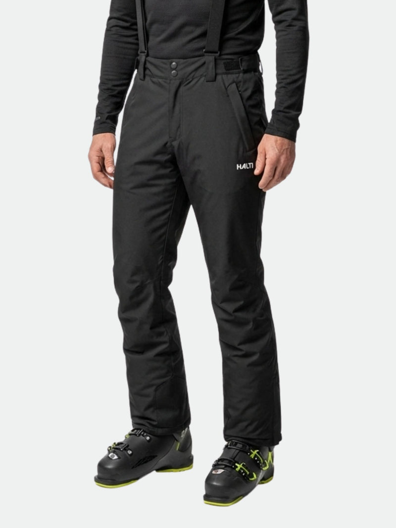 Halti Glades II DX Men's ski pants, black, waterproof DrymaxX fabric with adjustable suspenders and button closure.