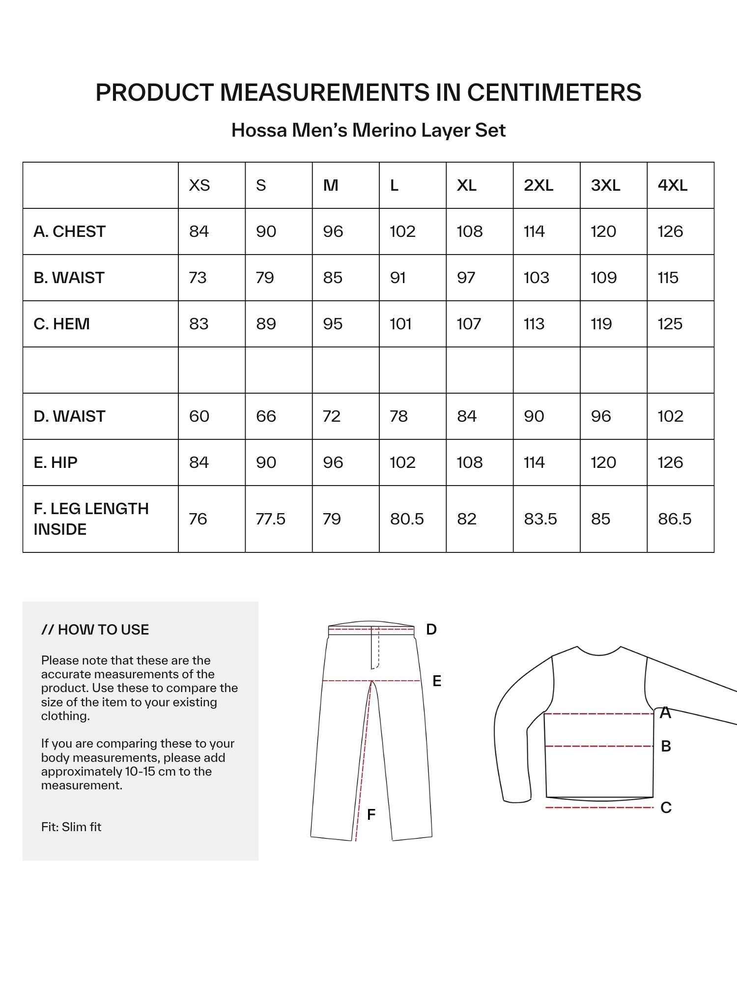 Choose the right size: Model in the picture is 182 cm long and is wearing size M. The Hossa Men's Merino base layer set has a looser fit, so if you are choosing between two sizes, we recommend choosing the smaller size for a more snug fit. Use our Size Guide if you are unsure of your size.