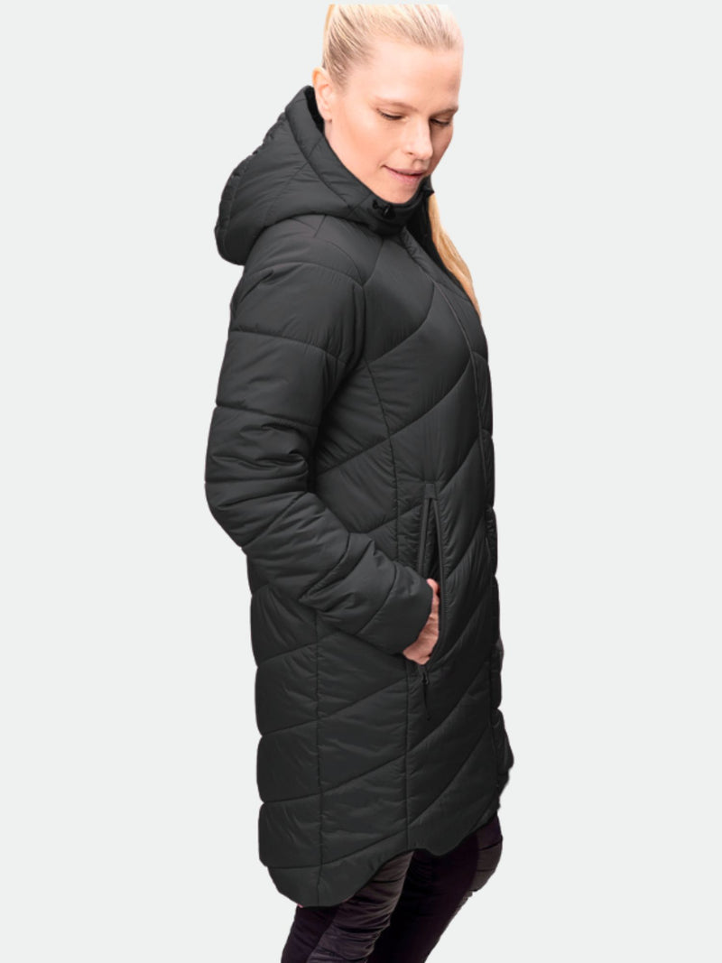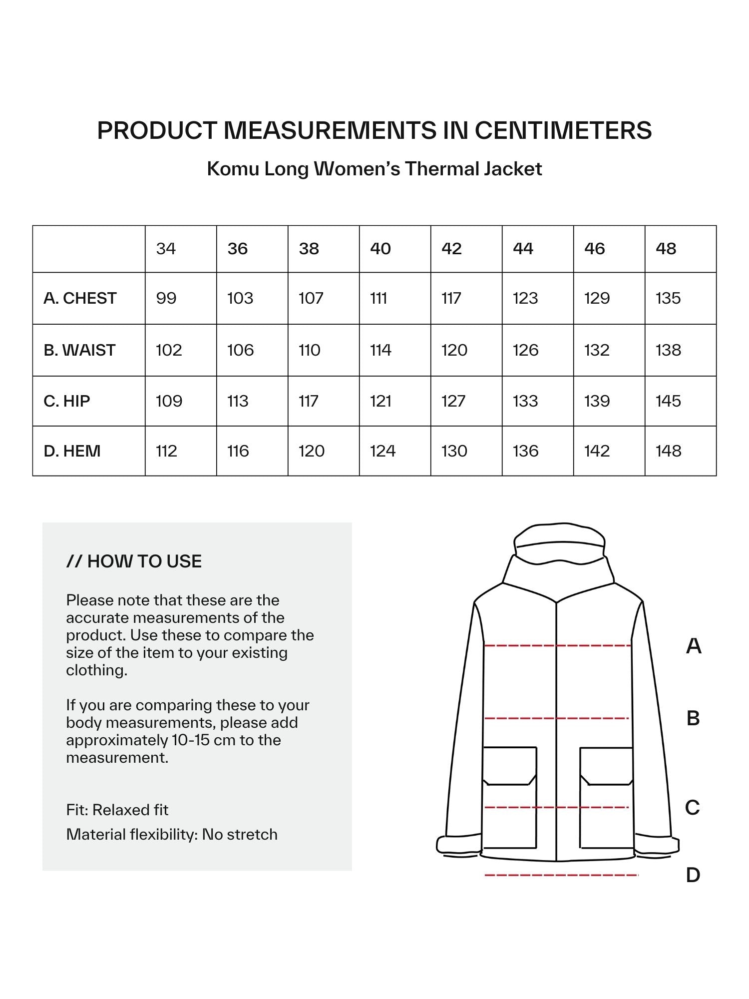 Designed with practicality in mind, the Komu Jacket is constructed with narrow panels, making it incredibly flexible and easy to pack. You can carry it with you wherever you go, ensuring you always have extra warmth on hand. This knee-length jacket boasts a beautiful, soft outer fabric that not only protects you from the wind but also repels water, keeping you dry and comfortable.