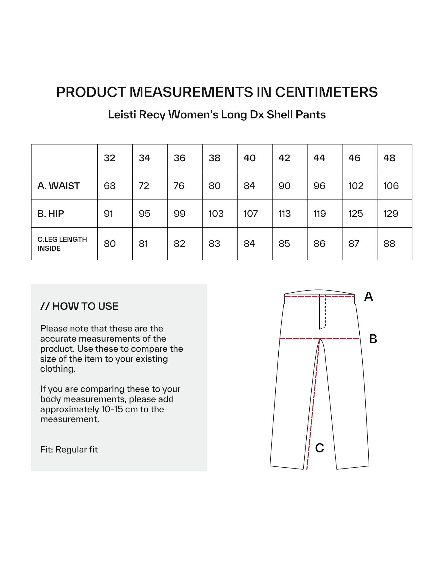 Women's classic shell pants with clean cut for all weather conditions with a longer leg length. Use these waterproof and windproof pants for hiking and walking, when you need protection from wind and rain. The pant's stretchable material creates a great fit. The many functional details such as belt loops, zipper pockets, and adjustable leg-ends make this pant a good addition to any Halti jacket. Halti ECO product as these pants are made partly of recycled polyester and have environmentally friendly fluorocarbon-free water-repellent treatment. Check also Leisti pants with short and normal leg length.