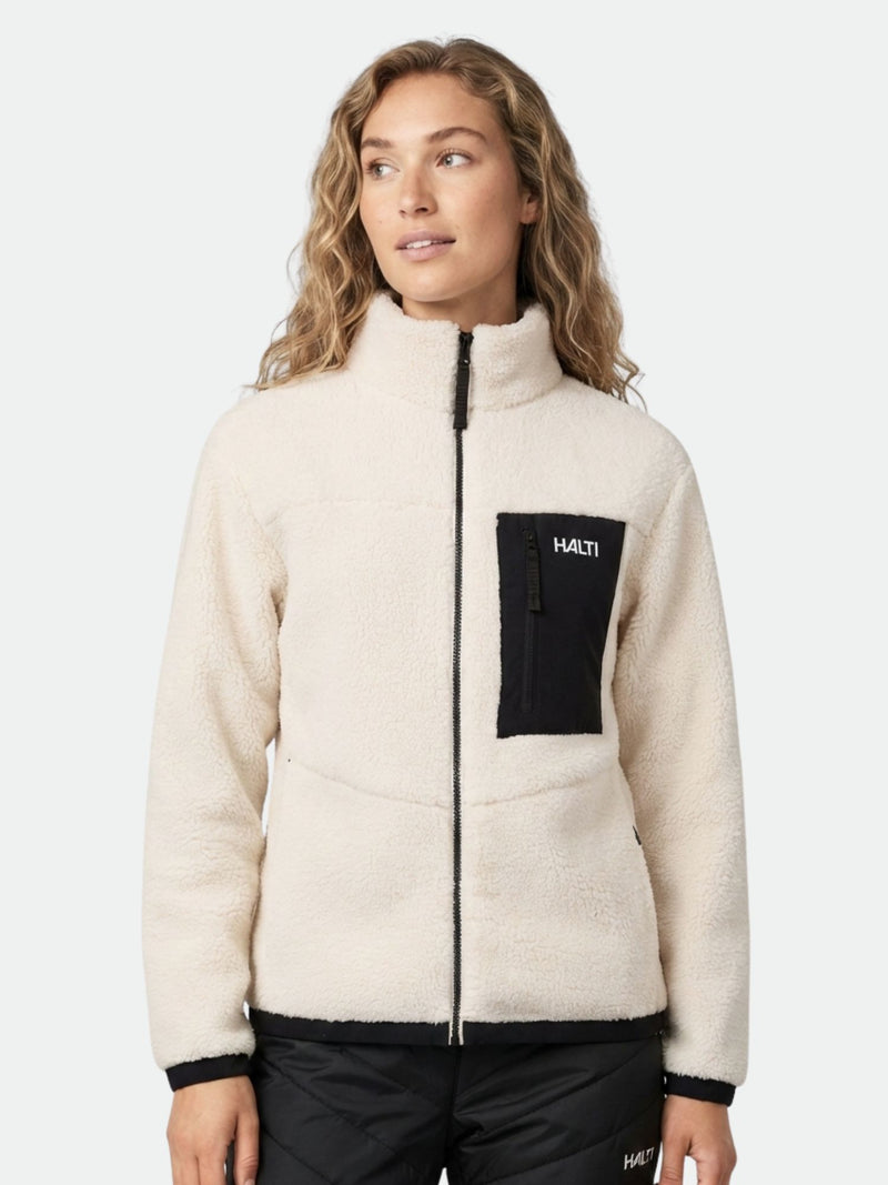 A woman wears the Halti Lumista Polar Fleece Jacket in white with a black chest pocket and logo, against a plain background.