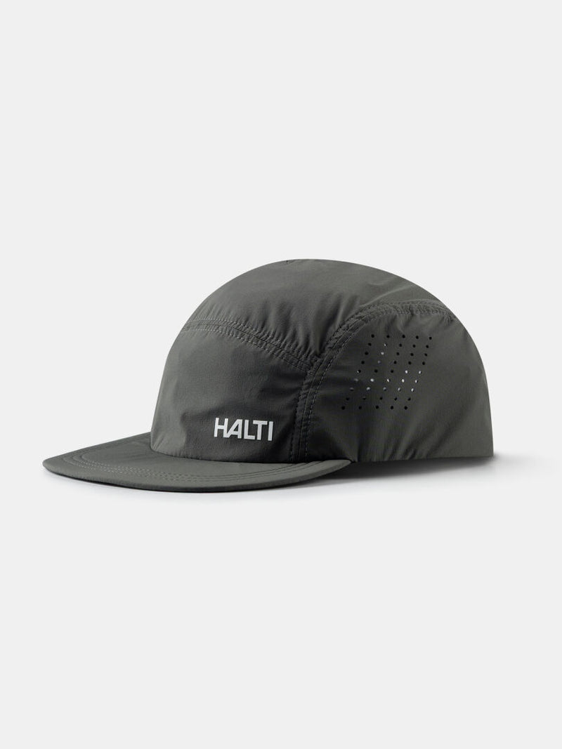 The Halti Luovi Cap is a dark grey running cap with a flat brim and small ventilation holes, shown on a light background.