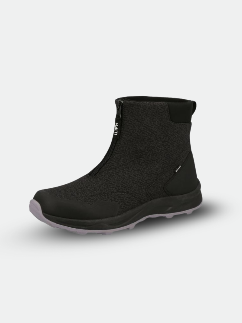 Lightweight and sporty waterproof ankleboot with zipper in front and spike outsole. Upper is recycled softshell fabric, with rubber toe and elastic collar for added comfort. DrymaxX membrane keeps feet dry, and Halti's GripmaxX Spike rubber outsole with 17 carbon steel spikes gives perfect traction on slippery slopes. Comfort and safety for winter walks.