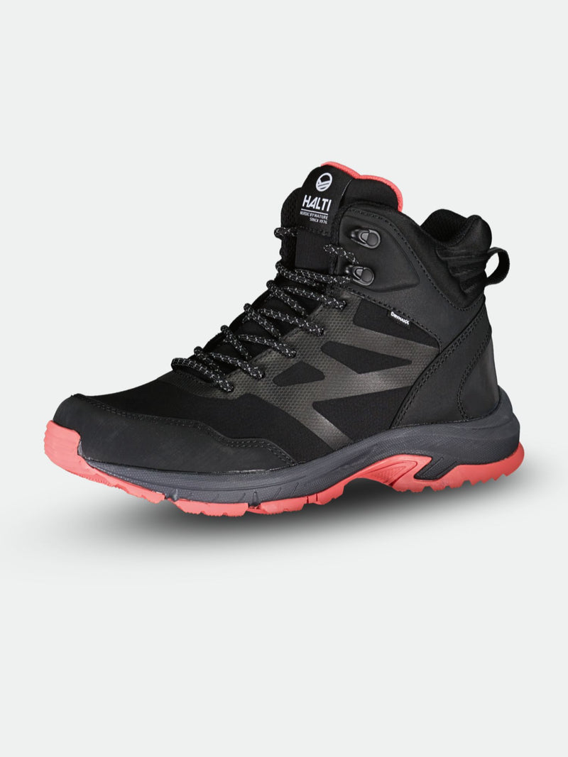 Waterproof midcut outdoor shoe with reflective features. Upper softshell is made of recycled polyester, and decorative print is reflective tpu, as well as heel part. Perfect walking shoe for fall and winter outdoor activities, highly visible in darkness, with DrymaxX membrane to keep feet dry, and Halti GripmaxX outsole for good grip.