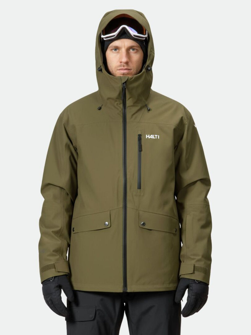 Halti Settler 3L DX Men's ski jacket in olive green with black zipper, chest pocket, two flap pockets, and chest logo.