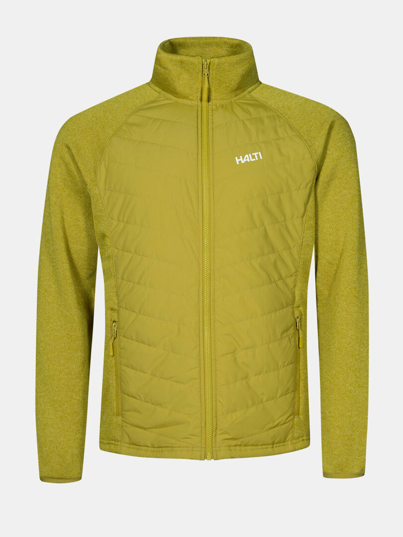 The Halti Streams Hybrid Layer Jacket Men's is a yellow-green mid layer with quilted back and stand-up collar for outdoors.