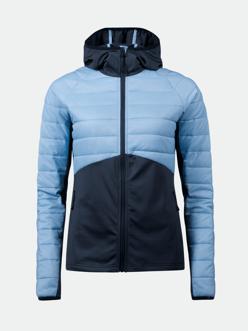 The Halti Veidnes Women's Insulation Jacket features a light blue quilted top, dark blue bottom, hood, and front zipper.