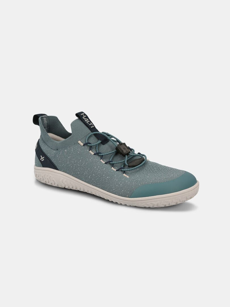 The Halti Vire Barefoot Shoe Men's is a teal and grey zero-drop sneaker with toggle laces and a white sole.